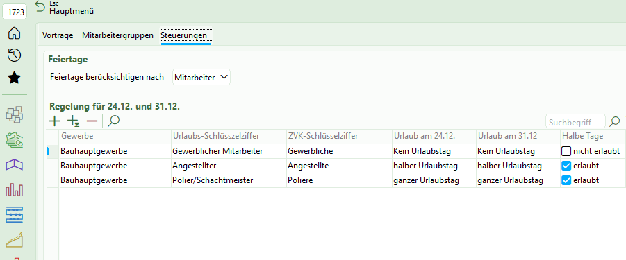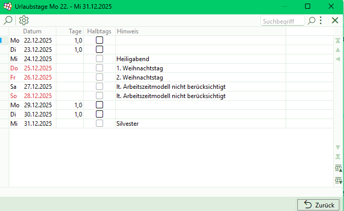 Feiertage - die ja je nach Bundesland unterschiedlich sind - und Ihr mitarbeiterspezifisches Arbeitszeitmodell bzw. Ihre Betriebsferien werden vom Programm bei der Ermittlung der Restansprüche berücksichtigt. Informationen über gewährten