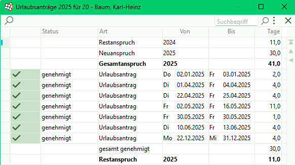 Nach Genehmigung der Urlaubsanträge sind mitarbeiterbezogene Ausdrucke möglich. Auf Wunsch lassen sich Gesamtübersichtslisten aller Urlaubsanträge für einen frei bestimmbaren Zeitraum und einer bestimmten Mitarbeiterkategorie anzeigen.